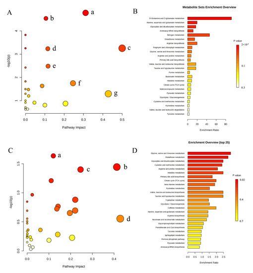 Summary of pathway analysis and MSEA. (A) Pathway analysis of metabolites identified by 1H-NMR. (a) Alanine, aspartate and glutamate metabolism; (b) glyoxylate and dicarboxylate metabolism; (c) D-glutamine and D-glutamate metabolism; (d) glutathione metabolism; (e) arginine biosynthesis; (f) glycine, serine and threonine metabolism; (g) taurine and hypotaurine metabolism. (B) MSEA of metabolites identified by 1H-NMR. (C) Pathway analysis of metabolites identified by UPLC-MS. (a) Glutathione metabolism; (b) glyoxylate and dicarboxylate metabolism; (c) glycine, serine and threonine metabolism; (d) taurine and hypotaurine metabolism. (D) MSEA of metabolites identified by UPLC-MS.