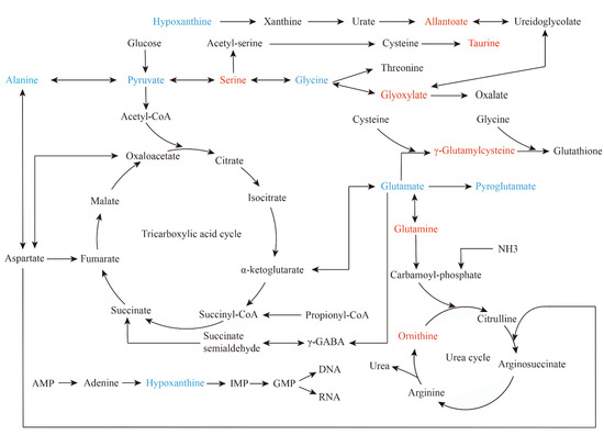 Summary of significant metabolic pathways about sensitivity to NAC in bladder cancer. It is mapped according to KEGG pathway (https://www.genome.jp/kegg/pathway.html (accessed on 11 April 2022)). Red represents elevated metabolites in the sensitive group, and blue represents reduced metabolites.