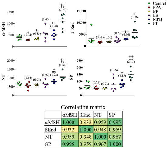 Effects of bee pollen and probiotic intestinal microbiota on neuropeptide levels in a rat model of autism. Unpaired t-test was used to test the significance of differences between the control group and each of the remaining groups. Corresponding p values of <0.05 and <0.005 are indicated by “*” and “**”, respectively. Differences between the PPA group and each of the other non-control groups were similarly tested, and corresponding p values of <0.05, <0.005, and <0.0005 are indicated by “+”, “++”, and “+++”, respectively. Fold change relative to controls is indicated in parentheses. PPA: propionic acid; BP: bee pollen; LB: Lactobacillus; MPB: mixed probiotic bacteria; FT: fecal transplant. The correlation matrix shows correlations between the neuropeptide levels (bottom). Correlation was calculated using Pearson product–moment correlation analysis. The heatmap shows r values. The p values associated with r at 95% confidence interval are 0.007, 0.002, 0.00004, 0.004, 0.00249, and 0.00158 for α-MSH/β-End, α-MSH/NT, α-MSH/SP, β-End/NT, β-End/SP, and NT/SP, respectively.