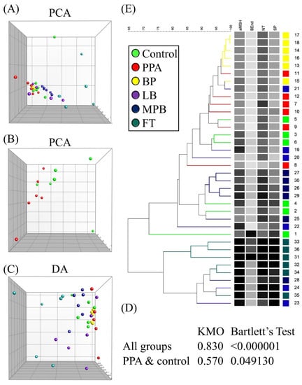 Clustering of treatment groups using principal component analysis (PCA) (A,B), discriminant analysis (DA) (C), and hierarchical clustering (E). PC1 and PC2 in PCA and DA are represented by the x and y axes, respectively. Kaiser–Meyer–Olkin (KMO) and Bartlett’s test of sphericity results are shown for all groups and PPA and control groups (D).