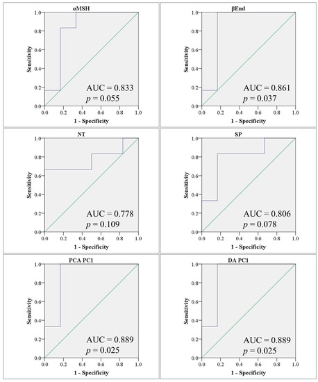 The value of combining biomarkers is not clear from the current data. At 100% sensitivity, the specificity is lower than independent α-MSH. However, the sample size is small in the current study, which means a bigger sample is needed to determine whether other neuropeptides are valuable and whether a multivariate combination biomarker is better than α-MSH alone.