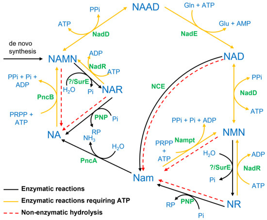 Schematic representation of reactions involved in the biosynthesis of NAD in different organisms. Metabolite names are written in bold blue letters, while the enzyme names are denoted in green colour. The abbreviation NCE (NAD-consuming enzymes) represents all enzymes catalysing signalling reactions consuming NAD. The bold black lines represent enzyme-catalysed reactions, whereas the dotted red lines denote non-enzymatic hydrolysis, mainly occurring at high temperatures. Bold yellow lines are used to denote reactions that require ATP. Whether the bacterial 5′-nucleotidase SurE accepts NMN/NAMN as substrate is unknown; a homologue to the mammalian NT5 could not be identified in bacteria. NAD, Nam adenine dinucleotide; NMN, Nam mononucleotide; NR, Nam riboside; NA, nicotinic acid; NAR, NA riboside; NAMN, NA mononucleotide; NAAD, NA adenine dinucleotide; NadD, NA/NMN adenylyltransferase; Nampt, Nam phosphoribosyltransferase; NadR, NA/Nam riboside kinase; SurE, 5′-nucleotidase; PNP, purine nucleoside phosphorylase; PncA, nicotinamidase; PncB, NA phosphoribosyltransferase; NadE, NAD synthase.