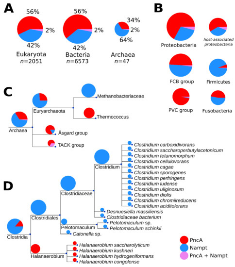 Phylogenetic distribution of PncA and Nampt among the three domains, with expansion into archaea and the bacterial taxa of clostridia. Panel (A) shows the total number of organisms (n) represented in the phylogenetic analysis, per domain, as well as their proportions as coloured in the following scheme (PncA, red; Nampt, blue; both PncA and Nampt, violet). The numeric proportion is written beside each segment of the pie chart. The pie chart sizes in each panel are scaled proportionally to the logarithm of the number of organisms represented in each group. In panel (B), the enzyme distribution in the largest bacterial clades is shown. Host-association patterns in the proteobacterial group are also shown as an additional pie chart to the right of the total proteobacterial pie chart. Panel (C) expands on the domain of archea, particularly to two clades within the phylum euryarchaeota that have presence of only PncA (Thermococcus) or Nampt (Methanobacteriaceae). Panel (D) expands on the bacterial class of clostridia, which is a member of the phylum firmicutes. Clostridia is one of several bacterial classes that exhibit a clear preference for PncA in extremophiles, based on our phylogenetic analyses. Branch lengths of the trees are arbitrary.