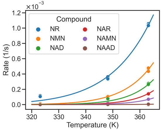 Temperature dependency of non-enzymatic hydrolysis of metabolic intermediates of NAD biosynthesis. Temperature on x-axis is reported in Kelvin (K). Hydrolysis rates are given per second (1/s). While the solid dots represent measured hydrolysis rates, the solid lines denote the temperature-dependent hydrolysis rates calculated using a fitted Arrhenius equation (cf. Table 1). NAAD shows the lowest hydrolysis rates, while NR exhibits the highest glycohydrolysis rate at 363.15 K.