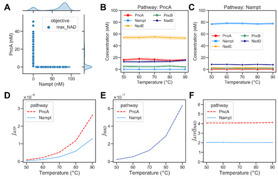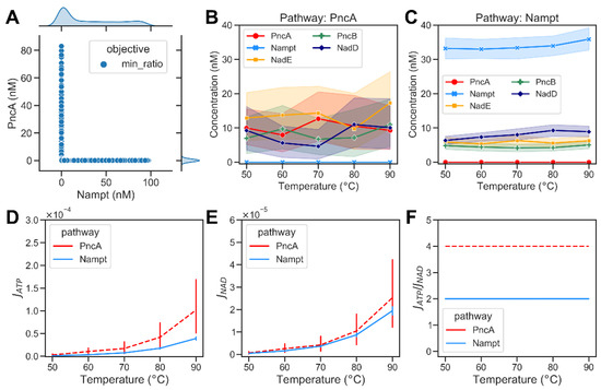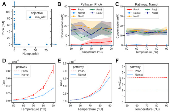 where the argument E (, where and ) in the interval [1−10, 100] maximizes the NAD concentration (CNAD), with the added constraints that the sum of concentrations of metabolic enzymes is less than 1000 and the subset B is the set of all elements , such that is in the interval [0.01, 100] . We again predominantly found solutions with low abundance of either PncA or Nampt. The PncA pathway exhibited an optimal enzyme combination with a high abundance of NadE (cf. Figure 6A). This can be understood intuitively, as the system tries to compensate for the loss of NAD through high glycohydrolysis, especially at high temperatures. The ATP consumption flux in the PncA pathway was higher than that in the Nampt pathway at different temperatures, while the NAD production flux in both pathways was similar (Figure 6C,D). Consequently, the PncA pathway was found to consume more ATP per NAD produced at all temperatures (Figure 6E).