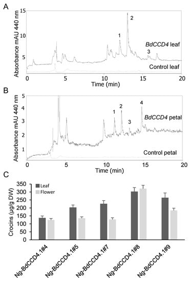 In conclusion, the results of this study demonstrated that the stable expression of BdCCD4.1 in N. glauca plants allowed the accumulation of up to 321.6 ± 21.3 µg/g DW and 302.7 ± 25.6 µg/g DW of crocins in petals and leaves, respectively, but it was lower in comparison with the expression of CsCCD2L. However, the obtained levels were higher than those previously reported in transient expression experiments in tobacco plants (79 µg/g) [], or in N. tabacum by chloroplast transformation expressing a CCD4 from Bixa Orellana (>50 µg/g) [], demonstrating that stable expression in N. glauca not only affords high levels of crocins, but importantly provides clues about the stability of these compounds in different tissues.