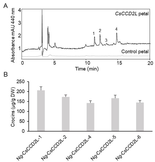 We evaluated the levels of crocins in the leaves and petals of control and transgenic lines of N. glauca plants. Crocins were only detected in transgenic lines, and in three out of the five lines, higher accumulation of crocins was observed in the leaf tissue, while two lines showed similar levels of crocins in the petals and leaves. However, the accumulated crocins were qualitatively different in terms of their glucosylation patterns. The addition of sugar moieties to the crocetin molecule is mediated in N. glauca by unspecific UDP-glycosyltransferases, which increase the solubility of crocins, allowing their transport to the vacuole []. Similarly, in N. glauca plants modified to produce ketocarotenoids, the levels of ketocarotenoids were higher in the petals than in the photosynthetic tissues, while the profile of the different ketocarotenoids was also different []. Interestingly, in transgenic lines expressing CsCCD2L, the levels of crocins in the petals were lower than those in the leaves. The higher accumulation in leaves might have been due to the presence of higher levels of the substrate zeaxanthin []. Nevertheless, this possible tissue-specific activity of endogenous CCDs in leaves and petals, acting to reduce the carotenoid pool, should also be considered, as well as the availability of free, non-esterified zeaxanthin for crocin biosynthesis.