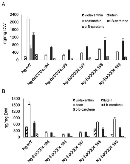 The levels of endogenous carotenoids were analyzed in the leaves and petals of transgenic BdCCD4.1 plants (Figure 4). Five major carotenoids were detected in the extracts of the control petals and leaves: violaxanthin, lutein, zeaxanthin, all-trans-β-carotene, and its geometric isomer 9-cis-β-carotene. In all of the transgenic lines, there was a reduction in the content of these carotenoids in the leaves as well as in the petals (Figure 4A,B). This suggests that the production of crocins occurred at the expense of the native carotenoids present in these tissues. In the leaves, zeaxanthin was not detected in the transgenic plants, and the lutein concentration was reduced by 74–92%. For β-carotene, the fluctuations were greater between the different lines, with a 23–70% reduction in its concentration with respect to the WT plants. Similar fluctuations have been previously observed in N. glauca plants engineered to produce ketocarotenoids []. Interestingly, the lower reduction in the β-carotene levels was observed in those lines accumulating higher levels of crocins (lines #7 and #9, with a 23.6% and 27.4% reduction, respectively). In the petals, a reduction in concentration was also observed for lutein and β-carotene, whose levels fluctuated within broad ranges of 44–92% and 45–71% for lutein and β-carotene, respectively. As observed in the leaves, a lower reduction was observed for lines #7 and #9, which showed higher levels of crocins in the petals (Figure 2).