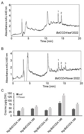 In order to quantify apocarotenoids in the plants, a previously described HPLC system [,]) was used for the analyses of the polar extracts of leaves and petals. Typical chromatograms of the apocarotenoids formed in the leaves and petals of transgenic N. glauca plants expressing BdCCD4.1 are shown in Figure 2. The profiles of crocins in the leaves and petals clearly differed between these tissues (Figure 2A,B), suggesting the presence of different tissue-specific endogenous glycosyltransferases. The predominant crocin moieties contained three and two glucose molecules. The amounts of crocins in petals and leaves in the transgenic lines are shown in Figure 2C. In three transgenic lines, the levels of crocins were higher in the leaves than in the petals (lines #5, #7, and #9). In the two transgenic lines, the crocin levels were similar in the leaves and petals (lines #1 and #8). The levels of crocins in the five lines we analyzed ranged from 137 to 302 µg/g. Previously, we analyzed the levels of crocins in N. glauca leaves from plants transformed with the saffron enzyme for crocin biosynthesis, CsCCD2L. The levels of crocins in the leaves of these plants were within the same order of magnitude, but higher than those obtained with BdCCD4.1 (1.5 fold difference on average) []. We also analyzed the crocin content of the petals of lines we had generated previously expressing CsCCD2L []. Interestingly, the levels of crocins in the petals from transgenic CsCCD2L were lower, with a range of 56–86 µg/g (Figure 3), than in the leaves, with a range of 280–394 µg/g [], suggesting a lower availability of substrates for CsCCD2L in the petals. In fact, zeaxanthin was found at higher levels in the leaves than in the petals in N. glauca, where lutein predominates [].