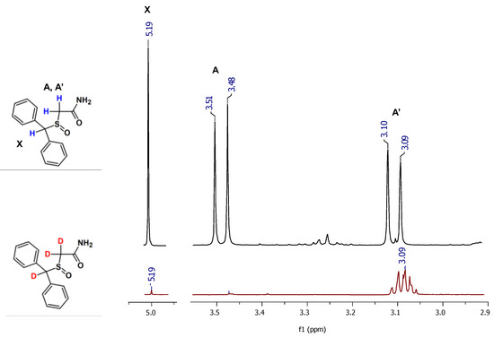 The presented 1H-NMR spectra (Figure 3) suggest that, after 1 h of HDX reaction, the signal at 5.20 ppm, characterizing proton X, practically disappeared. The signals corresponding to the α-C hydrogens (A, A’) at 3.50 ppm and 3.10 ppm become a multiplet, which may suggest that a small amount of armodafinil is not completely deuterated and the signal for α-CHD group is observed. The incomplete deuteration was also present on the obtained mass spectra (Figure 1 and Figure 2), where the small signal corresponding to the 297.072 m/z was presented.