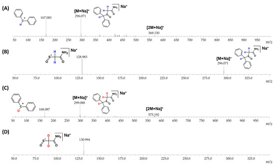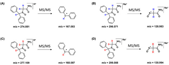 During the MS and MS/MS analysis of the deuterated and non-deuterated analogues of armodafinil, the different fragment ions were found (Figure 4, Figure 5 and Figure 10). In the ESI-MS analysis (Figure 4A,C), the high intense signal at 167.087 (Figure 4A) and at 168.087 (Figure 4C), characterizing the diphenylmethylium carbocation was observed. Additionally, the signal corresponding to the protonated armodafinil ion was not observed. The lack of observation of the [M+H]+ ion is a consequence of its low stability in the ion source, leading to the formation of diphenylmethylium according to the charge-directed mechanism [34]. Additionally, in the MS/MS spectra (Figure 4B,D), the fragmentation of sodium adduct of armodafinil ([M+Na]+), resulted in the formation of (2-amino-2-oxoethyl)(oxo)-sulfanyl radical. This observation is a consequence of the charge-remote fragmentation mechanism of [M+Na]+ ion of armodafinil [48].