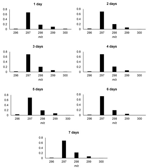 Hydrogen–deuterium exchange and deuterium–hydrogen exchange (DHX) usually present the same kinetics with some differences depending on the possibility of hydrogen- or deuterium bonds formation and the spatial structure of chemical compounds [34,35]. Therefore, the analysis of the DHX kinetics on the arodafinil-d3 isotopologue was performed for the obtained armodafinil-d3 isotopologue and the results are presented as normalized values of signal intensities from ESI-MS isotope pattern (Figure 9). The separate armodafinil-d3 samples were incubated in the mixture of 1% TEA/H2O/MeCN from 1 to 7 days. The obtained results revealed that in all cases the most intensive signal at 297.072 m/z, corresponding to the armodafinil derivative containing one unexchanged deuteron (Figure 9).