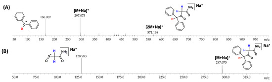To determine the location of the remained deuterium atom after the DHX, the MS/MS experiments were performed, and the obtained spectra are presented in the Figure 10. The ESI-MS spectrum of armodafinil-d1 obtained after the analysis of DHX presents intensive signal at m/z 168.087 corresponding to the secondary carbocation containing deuterium atom (Figure 10A). The MS/MS spectrum obtained for parent ion at m/z 297.075 shows the signal corresponding to the aliphatic radical coordinating sodium ion at m/z 128.983 without any deuterium atom (Figure 10B). The obtained results clearly indicate that the unexchanged deuterium atom remained at the carbon atom within the diphenylmethyl group.