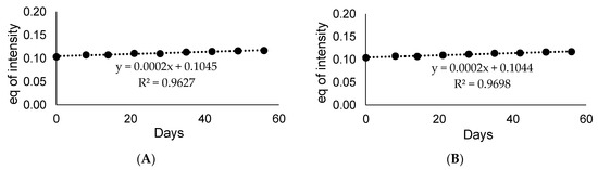 Stability curve of (A) non-deuterated armodafinil and (B) armodafinil-d3 measured till two months for the ion (A) 296.071 m/z and (B) 299.088 m/z.
