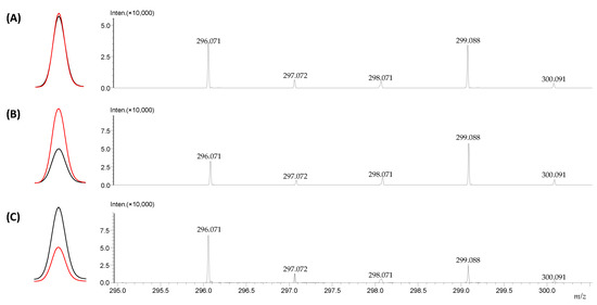 The presented extracted ion chromatograms (Figure 12) of the armodafinil (black line) and armodafinil-d3 (red line) isotopologues presents practically the same chromatographic behavior for all the analyzed samples containing different amounts of isotopologues (Figure 12A–C). The proportion of signals corresponding to the armodafinil and armodafinil-d3 analogues to their amount in the analyzed mixtures was confirmed. Additionally, the isotopic distribution presented on the obtained mass spectra clearly corresponds to the composition of the analyzed mixtures.