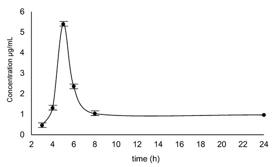 The human urine samples collected after 3, 4, 5, 6, 8 and 24 h after taking 200 mg of armodafinil by one patient were analyzed. The obtained results are presented in the Figure 14. The maximum concentration of armodafinil after single-dose was found in the urine sample collected after 5 h of its taking, at the level of 5.3 µg/mL. It was observed that armodafinil is readily absorbed after oral administration and also readily eliminated. After reaching peak, urine concentration of armodafinil decreases relatively quickly. The obtained results correspond to the data presented previously by two clinical teams [37,38].