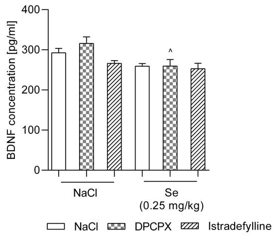 As shown in Figure 3, neither DPCPX (1 mg/kg) nor IST (0.5 mg/kg) or Se (0.25 mg/kg) administered alone induced statistically significant changes in the BDNF level in mice serum (p > 0.05) compared to the NaCl-treated group. Only in the group which received DPCPX + Se was a significant decrease in the level of BDNF noticed when compared to the DPCPX-treated group (p < 0.05). There were no statistically significant changes compared to the NaCl-treated group in any of the groups which received the combination of tested compounds (p > 0.05).