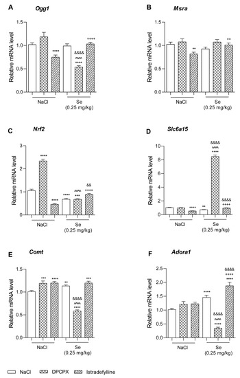 Comt. As presented in Figure 4E, the administration of DPCPX, IST, and Se alone and the co-administration of IST with Se significantly increased the relative mRNA level of Comt when compared to the NaCl-treated group (p < 0.001, p < 0.0001, p < 0.01, and p < 0.001, respectively). The co-administration of DPCPX and Se resulted in a significant decrease in Comt expression in comparison to the NaCl-, DPCPX-, and Se-treated group (p < 0.0001).