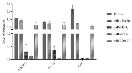 qPCR analysis of the expression levels of PCSK7 mRNA and predicted microRNAs in three examined cell lines: HEK293T, HepG2, and Huh7. The expression level of PCSK7 mRNA is the highest in Huh7, whereas miR-143-3p and miR-409-3p have the lowest expression in all the examined cell lines.