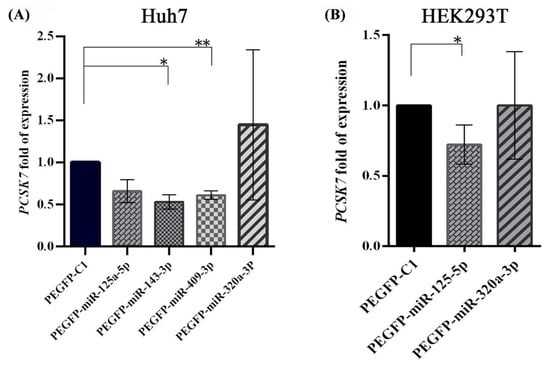 Expression levels of PCSK7 after miRNA overexpression in Huh7 (A) and HEK293T (B) cells compared with their mock vector counterpart. A,B) The expression level of PCSK7 mRNA in Huh7 cells was significantly downregulated by miR-143-3p and miR-409-3p. In both Huh7 and HEK293T cell lines, miR-125a-5p downregulated PCSK7 expression, although the difference did not reach statistical significance in Huh7 cells (p = 0.06). In addition, miR-320a-3p could not downregulate the expression of PCSK7 in either Huh7 or HEK293T cells. * and ** stand for p value less than 0.05 and 0.01, respectively.
