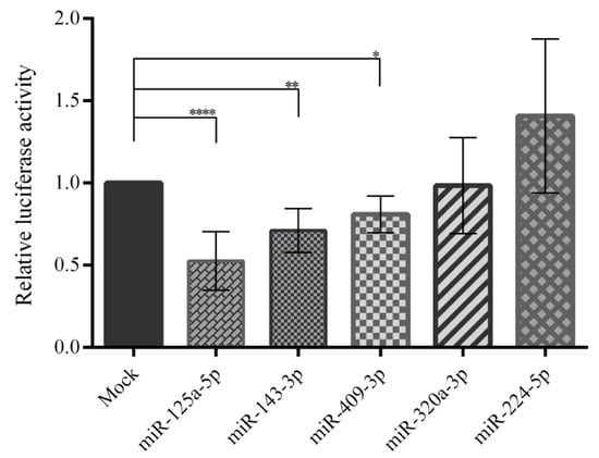 Luciferase assay results following co-transfection of the miR-overexpressing vector and the 3′-UTR of the wild-type PCSK7 in HEK293T cells. Relative luciferase activity considerably decreased after the overexpression of mir-125a-5p, miR-143-3p, and miR-409-3p; however, there was no significant alteration in relative luciferase activity for miR-320a-3p and miR-224-5p, which were used as controls. *, **, and **** stand for p value less than 0.05, 0.01 and 0.0001.