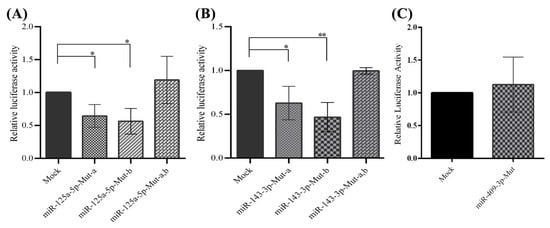 Luciferase assay analysis of cells co-transfected with the miR-overexpressing vector and miRNA target-site-deleted (Mut) psiCHECK-2 vectors in the HEK293T cells. The results demonstrate a direct interaction of miR-125a-5p, miRNA-143-3p, and miR-409-3p with the 3′-UTR of PCSK7. (A) Both target sites of miR-125a-5p in the 3′-UTR were functional. There was no significant alteration in relative luciferase activity in cells transfected with miR-125a-5p, Mut-a,b in the 3′-UTR of the psiCHECK-2 vector, in which both target sites in miR-125a-5p were omitted. Relative luciferase activity significantly decreased following miR-125a-5p overexpression in Mut-a,b in the 3′-UTR of the psiCHECK-2 vector, in which only one target site of miR-125a-5p was deleted. (B) The two miRNA-143-3p target sites in the 3′-UTR of PCSK7 are functional. No significant alteration was found in the relative luciferase activity in cells transfected with the miR-143-3p-overexpressing vector and Mut-a,b in the 3′-UTR of the psiCHECK-2 vector, in which both miR-143-3p target sites were deleted. However, the relative luciferase activity significantly diminished following the co-transfection of the miR-143-3p-overexpressing vector and Mut-a,b in the 3′-UTR of the psiCHECK vector, in which only one target site was absent. (C) No significant changes were observed in luciferase activity after the deletion of the only target site of miR-409-3p in the 3′-UTR of PCSK7. Mut-a stands for the deletion of the first target site, Mut-b stands for the deletion of the second target site, and Mut-a,b stands for the deletion of both miRNA target sites. * and ** stand for p value less than 0.05 and 0.01, respectively.