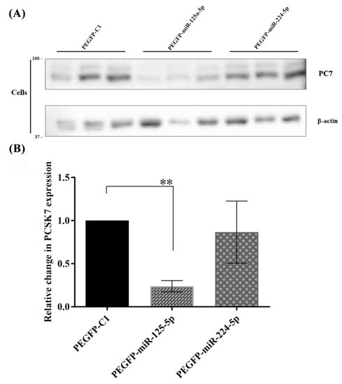 Western blot analysis of PC7 in Huh7 cells, in which miR-125a-5p and miR-224-5p were overexpressed. (A) The expression of PC7 protein was significantly diminished by miR-125a-5p at 48 h post-transfection compared to mock counterpart vectors, whereas miR-224-5p did not change the protein levels of PC7. (B) The result of quantified bands using the NIH ImageJ software and statistical analysis demonstrated a reduction in the PCSK7 expression due to the overexpression of miR-125a-5p (p = 0.0025) at 48 h post-transfection, whilst there was no significant change in the expression of PCSK7 following the overexpression of miR-224-5p (p > 0.05) in Huh7 cells. ** stand for p value less than 0.01.