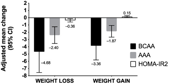 Figure 1 summarizes how BCAA/AAA levels and HOMA-IR2 index vary according to weight changes. Both adolescents who experienced weight loss or gained weight had significant changes in their BCAA/AAA concentrations and HOMA-IR2 index. Among adolescents who lost weight, BCAA concentrations decreased by −4.68 (95% CI, −7.55 to −1.81), AAA by −2.40 (95% CI, −3.55 to −1.24), and HOMA-IR2 by −0.36 (95% CI, −0.59 to −0.13) (Table S1). Among adolescents who gained weight, we noted a decrease of −3.86 (95% CI, −5.81 to −1.91) for BCAA and −1.87 (95% CI: −2.67 to −1.07) for AAA, whereas an increase of 0.15 (95% IC, 0.02 to 0.27) was observed for the HOMA-IR2 index (Table S2).