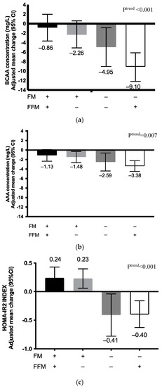 2.3. Changes in BCAA and AAA Concentrations and HOMA-IR2 According to Fat Mass and Fat-Free Mass Changes