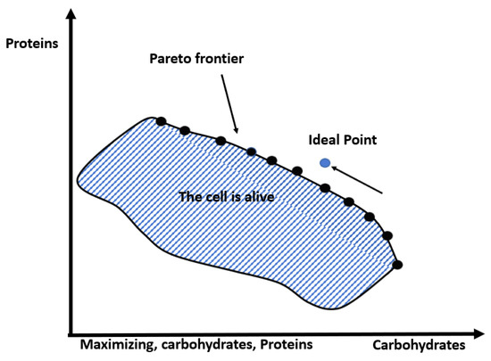 The main goal for multi-objective optimization is a good approximation of the Pareto frontier, cf. [28]; Figure 1 illustrates this within a metabolite context in a bi-objective function maximizing carbohydrates and proteins [29]. In this field, Multi-objective Evolutionary Algorithms (MOEAs) are widely recognized. Mainly, the algorithm NSGAII (Non-Dominated Sorting-based multi-objective EA) proposed by [30,31] has been quite effective when handling two or three objectives [32,33]. Based on the survey in [34], the only related work that uses NSGAII for FBA optimization is by Costanza et al. [35].