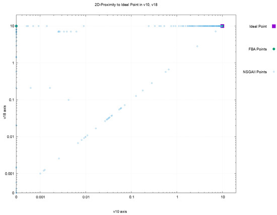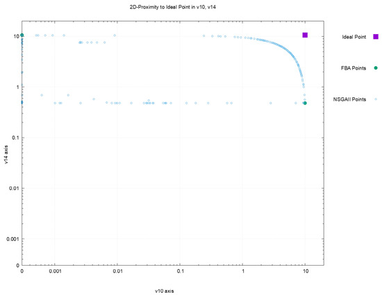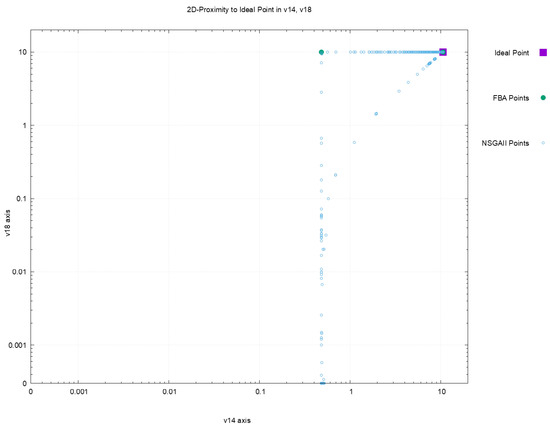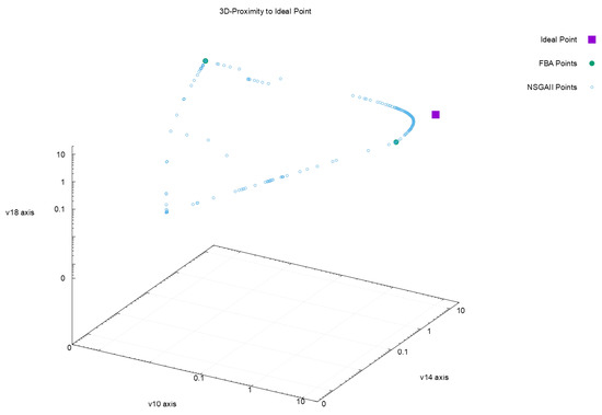 Figure 2, Figure 3, Figure 4 and Figure 5 offer a perspective of the behavior of NSGAII concerning the spread indicator applied to the results achieved in the configuration . All these figures show the ideal point in purple color, the three solutions reported by FBA in green color, and all the solutions reported by NSGAII are in blue circles. From these graphics, three main observations must be commented on: (1) first, the solutions of NSGAII describe the real contour of the Pareto frontier, while the solutions by FBA are only extreme points; (2) there exist solutions closers to the ideal point even though FBA warranty optimal solutions; and (3) the solutions of NSGAII are widely spread in the Pareto frontier. Hence, from the previous observations, it can be noted that NSGAII spread improves that of FBA; this behavior is repeated in all the remaining configurations.