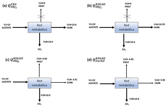 NSGAII can also produce solutions with similar fluxes’ values to those obtained from FBA. For example, in Figure 6b, values are almost equal to those in Figure 6a, where the produced fluxes point to the generation of Carbohydrates and CO. However, these solutions compromise protein production, such situation implies null growth and an undesirable condition for a real process, as discussed in previous experimental research [15,37].