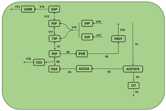 This work analyzes the FBA of an essential module of the microalgae Chlamydomonas reinhardtii. Figure 7 presents the related metabolic network, and Table 4 the corresponding reactions. This case presents three bioproducts of interest: proteins, carbohydrates, and (denoted here as , and ). Moreover, these networks show three primary substrates: acetate, E4P, and X5P (or , and , respectively). Optimizing the three bioproducts having as control decision variables is the base to validate NSGAII. The next section presents specific details on the performed experiment.