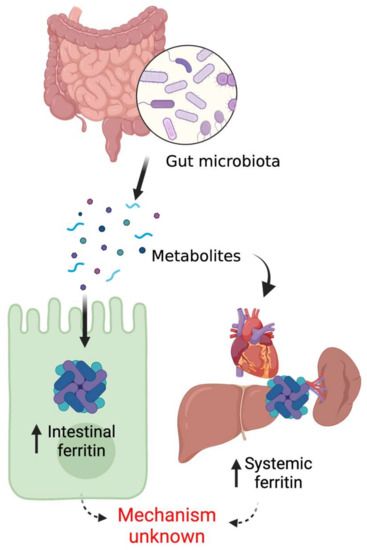 Ferritin is an important indicator of cellular redox balance, which is frequently altered in a wide spectrum of diseases, including chronic inflammation, metabolic disorders, and cancer [99,100]. Identification of specific microbial communities and bacteria-derived metabolites that modulate host ferritin would be potentially beneficial for pathophysiologic understanding as well as disease management. Successful development of in vitro co-culture with mammalian cells and in vivo colonization of germ-free gut models are needed to pinpoint the precise mechanisms of how gut microbiota or microbially derived metabolites regulate mammalian ferritin pathways.
