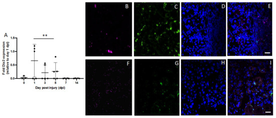 Dio3 and its expression in Pax7+ and MyoD+ stem cells. (A) Dio3 expression between days 0 and 14 after injury in Pax7+ stem cells as measured by RT-PCR. (B,C) In situ hybridization showing expression of Dio3 (pink) and isolated Pax7+ cells (green) and DAPI (D) on day 5 post injury. (E) Dio3 expression in only a few Pax7+ cells. (F,G) In situ hybridization showing Dio3 (pink) expression and MyoD+ cells (green), whereas DAPI is blue (H). (I) Merged image showing Dio3 expression on day 5 in MyoD+ cells. ** p = 0.003. Data are expressed as the mean ± SEM of at least three independent experiments. Images are representative of injury on day 5 in one of five different mice analyzed (n = 5). Scale bar = 50 µm.