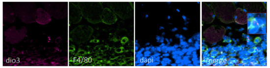 We sought to observe deiodinases in immune cells during the recovery process. While Dio2 was not detected in this type of cell, Dio3 was confirmed to be in macrophages during the recovery process, starting on day 1 (Figure 6).