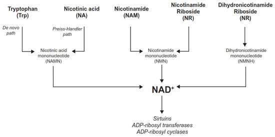 - Houtkooper, R.H.; Cantó, C.; Wanders, R.J.; Auwerx, J. The Secret Life of NAD+: An Old Metabolite Controlling New Metabolic Signaling Pathways. Endocr. Rev. 2010, 31, 194–223. [Google Scholar] [CrossRef] [Green Version]