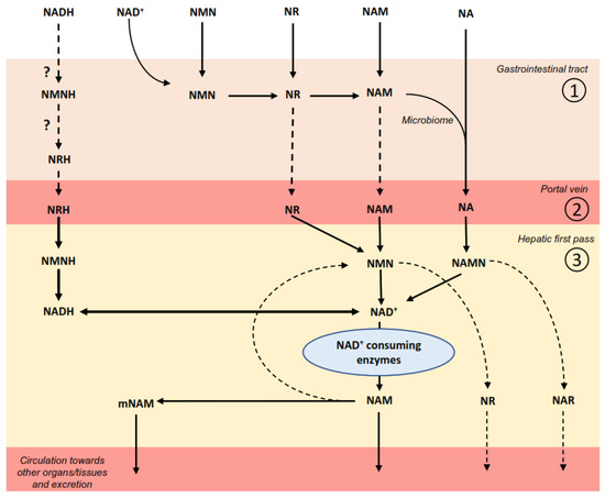 - Gross, C.J.; Henderson, L.M. Digestion and absorption of NAD by the small intestine of the rat. J. Nutr. 1983, 113, 412–420. [Google Scholar] [CrossRef]
