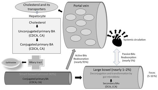 In detail, BAs deconjugation by gut microbiota is crucial for bile bio-transformation [15]: this small portion of BAs being microbially metabolized makes them more lipophilic, allowing the secondary BAs to be reabsorbed in the large bowel and returned to the liver, via the systemic circulation [7,11] (Figure 1).