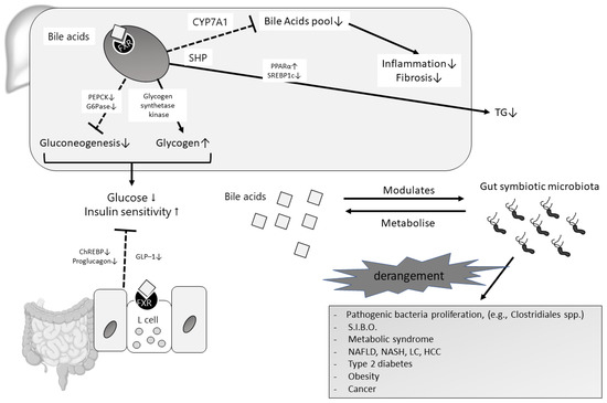 For example, the strong antimicrobial properties of BAs, and the maintenance of the eubiosis of gut microbiota, are mediated by a multifaceted mechanism of activation of FXR [3,39]. NAFLD offers a mechanistic example of dysregulation of BAs-FXR-mediated lipid and glucose metabolism [3,13]. Indeed, hepatic FXR activation mediated by BAs can induce the expression of atypical nuclear receptors small heterodimer partner (SHP), which promotes the inhibition of the sterol-regulatory element-binding protein-1c (SREBP-1c) (Figure 2), and ultimately leads to the reduced hepatic synthesis of triglycerides. Moreover, FXR can limit fat accumulation in the liver by promoting fatty acid oxidation after the activation of the hepatic NR peroxisome proliferator-activated receptor alpha (PPAR-α), and through plasma VLDL triglyceride clearance (Figure 2) [3,40,41]. FXR activation in the liver shows unidirectional effects on glucose homeostasis. It leads to the inhibition of gluconeogenesis and glycolysis through reduced expression of PEPCK phosphoenolpyruvate carboxykinase (PEPCK) and glucose-6 phosphatase (G6Pase), with a potential protective role in insulin resistance and type II diabetes (Figure 2). However, other studies fail to confirm these actions [42,43].