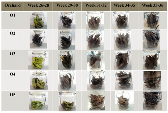 Figure 1 shows the carob fruit samples each week from the five different orchards. The dark brown color of the carob pods indicates the ripening of the fruit. For almost all orchards (O1, O3, O4, O5), between the 26th and 28th week of the examined period, the carobs were almost immature due to the green color except in the case of the orchard O2. From the 29th week of the examined period, the examined samples began ripening, reaching a dark brown color in the last week of the examination period.