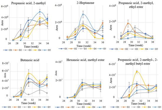 Overall, in the cases of the six selected VOCs, there were some fluctuations in the examined periods, with the highest abundance occurring around the 31st week. More specifically, propanoic acid, 2-methyl-(isobutyric acid) increased significantly in the 31st and 34th week of the examination period. Regarding 2-heptanone, no fluctuations were observed, reaching its maximum value in the 31st week, with the O5 area showing the greatest abundance. Furthermore, carobs showed the highest abundance of butanoic acid and hexanoic acid methyl ester in the 31st week. Similarly, propanoic acid, 2-methyl- and 2-methyl butyl esters reached their maximum abundance in the 31st week. However, the highest abundance of propanoic acid, 2-methyl-, ethyl ester was observed earlier (29th week).