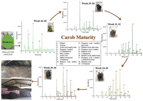 Stages of carob pods maturation through the HS-SPME-GC/MS chromatograms in each examined period (Week 26–36), and the respective influence of the maturation on the emitted volatile compounds.