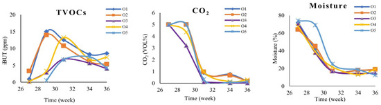 The trends of total VOCs (TVOCs), CO2 and humidity per week for the orchards studied (O1, O2, O3, O4, and O5).