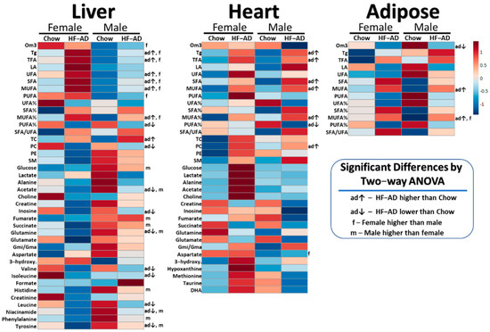 Two-way ANOVA revealed changes induced by ad libitum high-fat feeding that led to statistically significant differences in some measurable metabolite concentration in the liver, heart, and adipose tissues compared to rats eating standard chow, as shown in Table 1 and Table 2 for lipids and aqueous metabolites, respectively. A heatmap summarizing ANOVA is displayed in Figure 2.