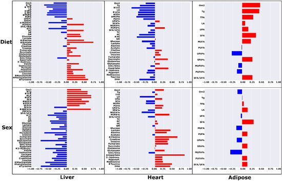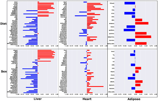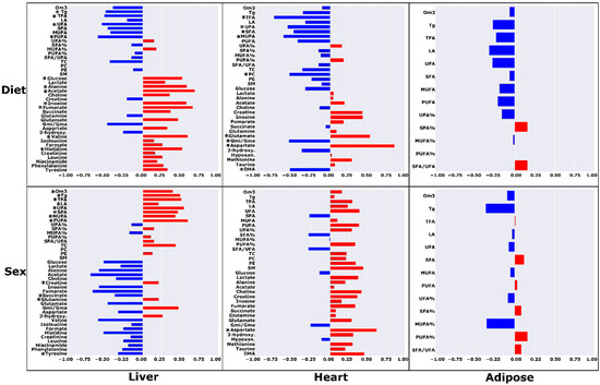 The partial correlations between metabolite concentrations and metadata controlled for diet or sex are shown in Figure 3. In the liver, there were higher concentrations of MUFA, TFA, triglycerides, SFA, linoleic acid, UFA, MUFA%, SFA%, the ratio of SFA/UFA, and total cholesterol, and lower levels of phenylalanine, creatine, phosphatidylcholine, PUFA%, UFA%, tyrosine, valine, acetate, inosine, isoleucine, and glutamine that significantly correlated with the HF-AD diet (R ≥ |±0.545|; p ≤ 0.035). For cardiac metabolites, higher levels of MUFA, TFA, SFA, triglycerides, MUFA%, phosphatidylcholine, glucose, and the ratio of glutamine over glutamate (Gmi/Gma), and lower levels of PUFA% significantly correlated with the HF-AD group (R ≥ |±0.0.488|; p ≤ 0.047). In adipose samples, higher levels of MUFA%, MUFA, SFA%, and SFA/UFA and lower levels of UFA%, omega-3, and linoleic acid were significantly correlated with the HF-AD group (R ≥ |±0.509|; p ≤ 0.044).