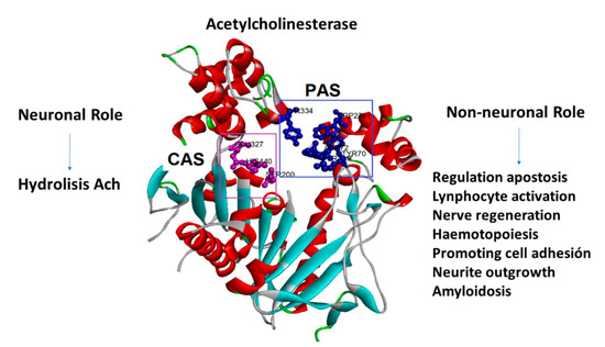 Acetylcholinesterase’s neuronal and non-neuronal roles. The amino acids that form the peripheral anionic site (PAS) are in blue, and the amino acids that form the catalytic site (CAS) are in purple.