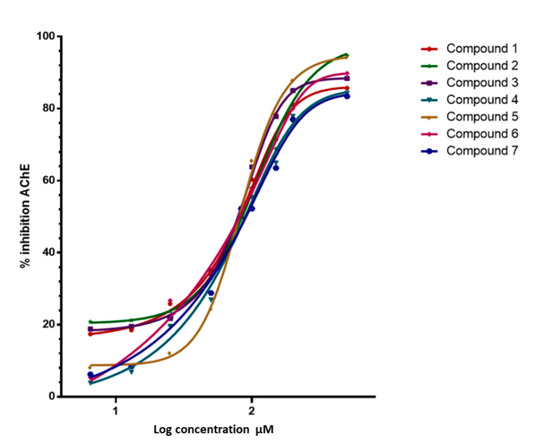 The docking binding energy for the compounds (1–7) had a good correlation with the experimental IC50 values (0.8831 Pearson products at the 95% confidence level) (Table 1). The compounds that show most negative downlink energy (2, 3, and 5) was bound to the active site by two or three conventional hydrogen bonds with residues near to aromatic cavity such as Ser 286, Phe 288, Arg 289, and Phe 330, and π-sigma, π-alkyl, and alkyl interactions with other residues of PAS (e.g., Tyr 70, Tyr 121, Trp 279, Phe 331, and Tyr 334). In contrast, compounds with higher binding energy and IC50 value present none or just one hydrogen bond; such is the case of compound 4. In the case of compound 7, an unfavorable negative–negative interaction with the residue Aps 285 was observed. It is a plausible explanation for its lower affinity.