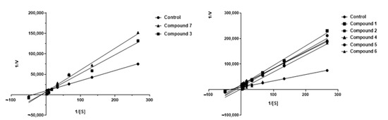 Graphical analysis of the Lineweaver–Burk plot gives information about the binding mode. As shown in Figure 4, the lines cross the first quadrant at the same point, and Vmax decreases as the concentration of compound 3 and 7 increases. The Lineweaver–Burk plot reveals that 3 and 7 are partially competitive AChE inhibitors.