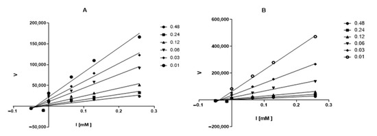 Dixon’s plot obtained for AChE in presence of increasing concentrations of ceanothanes 3 (A) and 7 (B). The initial compound concentration of compounds 3 (A) and 7 (B) was 0.48 μM and was subsequently diluted to get the set concentration of 0.01, 0.03, 0.06, 0.12 and 0.24 μM. [AChE] = 0.25 U/mL.